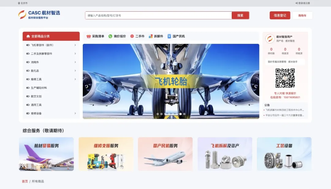 平台首期聚焦于新件、二手件及其国产民机消耗件三大品类,提供航材基础信息展示与查询、库存查询及商业线索留存等功能,帮助用户实现信息对接与商机触达。